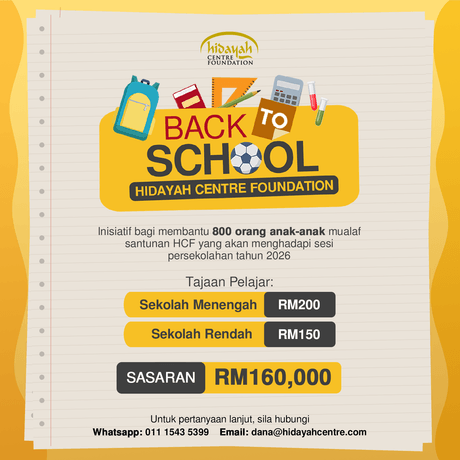 Hidayah Centre Foundation memerlukan bantuan anda untuk menaja anak-anak mualaf masuk ke sekolah dengan menaja keperluan seperti set uniform sekolah, kasut sekolah, stokin, set pakaian sukan